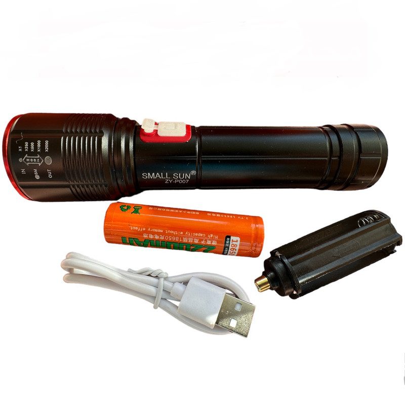 یکی از این مدل چراغ قوه ها چراغ قوه پلیسی اسمال سان (Small Sun) مدل P007 می باشد که دارای طراحی ارگونومیک بوده و در ساخت آن از آلیاژ آلومینیوم بهره گرفته شده است.این مدل چراغ قوه دارای لامپ بسیار قوی XP60 با قدرت روشنایی 1500 لومن و برد نور 500 متر بوده که نسبت به ابعاد آن بسیار چشمگیر است. این چراغ قوه حرفه ای دارای طراحی بسیار خاص و جدیدی است که از جمله زیباترین و قویترین چراغ قوه های شرکت اسمال سان می باشد.چراغ قوه ZY-P007 ضد آب و رطوبت بوده و همچنین دارای بدنه مقاوم در برابر ضربه و خراش می باشد. این چراغ قوه پلیسی از 1 عدد باتری لیتیومی 18650 اسمال سان با ظرفیت 2200 میلی آمپرک تغذیه می کند که می تواند تا 5 ساعت نور مورد نیاز شما را تامین کند. لازم به ذکر است که چراغ قوه P007 دارای شارژر USB تایپ سی ست که به همراه چراغ قوه در اختیار شما عزیزان قرار خواهد گرفت. چراغ قوه اسمال سان P007 دارای 3 حالت نوردهی پر نور، کم نور و چشمک زن می باشد. همچنین مدت زمان موزد نیاز برای شارژ کامل این دستگاه 5 تا 7 ساعت در نظر گرفته شده است. چراغ قوه P007 زوم دار بوده و از نقطه زنی خیلی خوبی برخوردار است که جدا ازین امتیاز، از پهنای نور گسترده ای هم برخوردار است. جهت بهبود عملکرد و شارژ اصولی این چراغ قوه باید در سطح شارژ باتری 15 تا 20 درصد شارژر را به دستگاه متصل کرده و به هیچ عنوان تا خالی شدن کامل شارژ آن دستگاه را روشن باقی نگذارید.